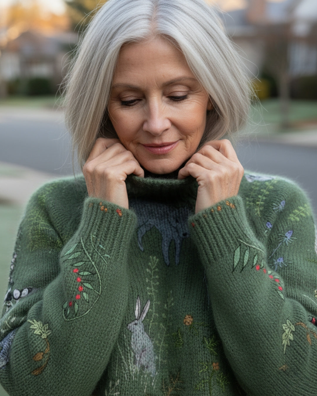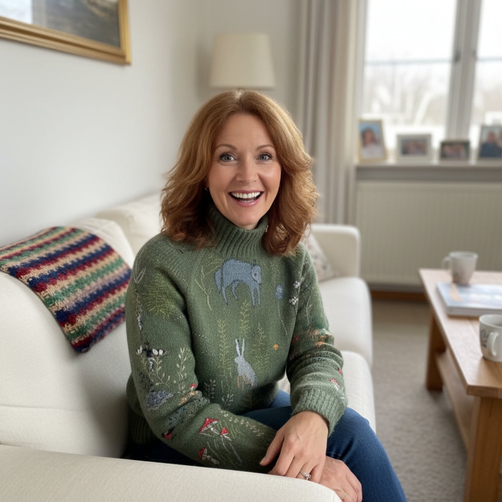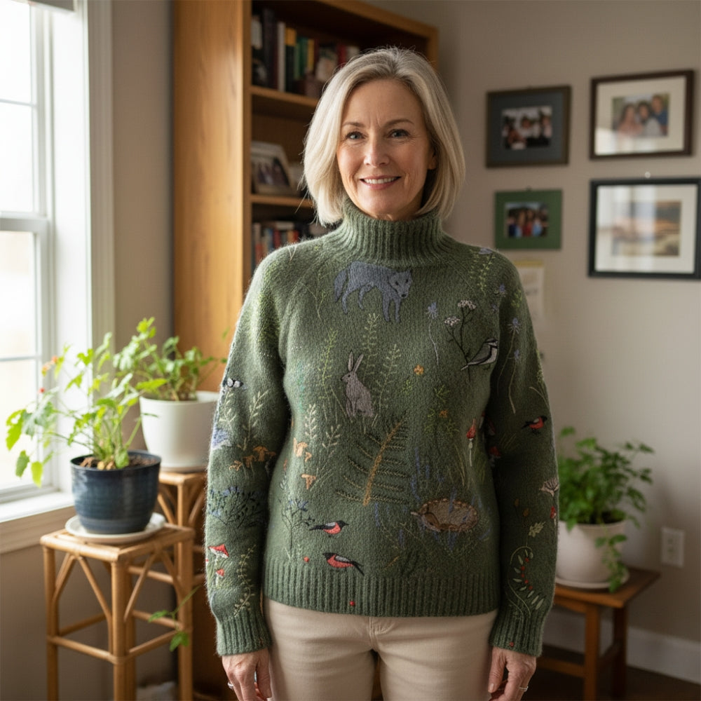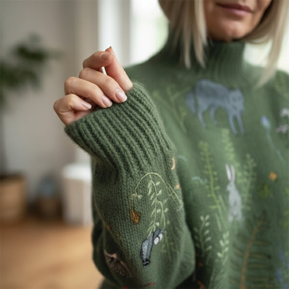 Matériel: Mélange de maille douce de qualité supérieure avec détails de forêt brodés à la main